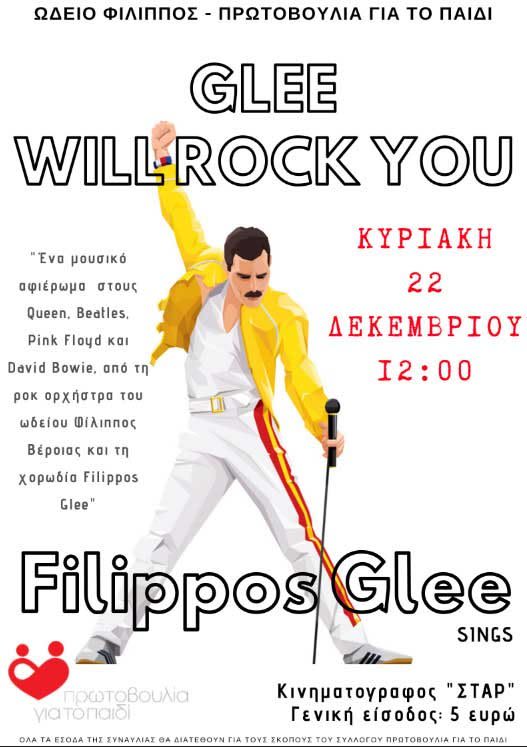 Η Πρωτοβουλία για το Παιδί και το Ωδείο Φίλιππος διοργανώνουν μία μοναδική μουσική παράσταση με τίτλο “Glee will rock you!”, που θα δοθεί στο κινηματοθέατρο «ΣΤΑΡ» την Κυριακή 22 Δεκεμβρίου 2019 στις 12:00.