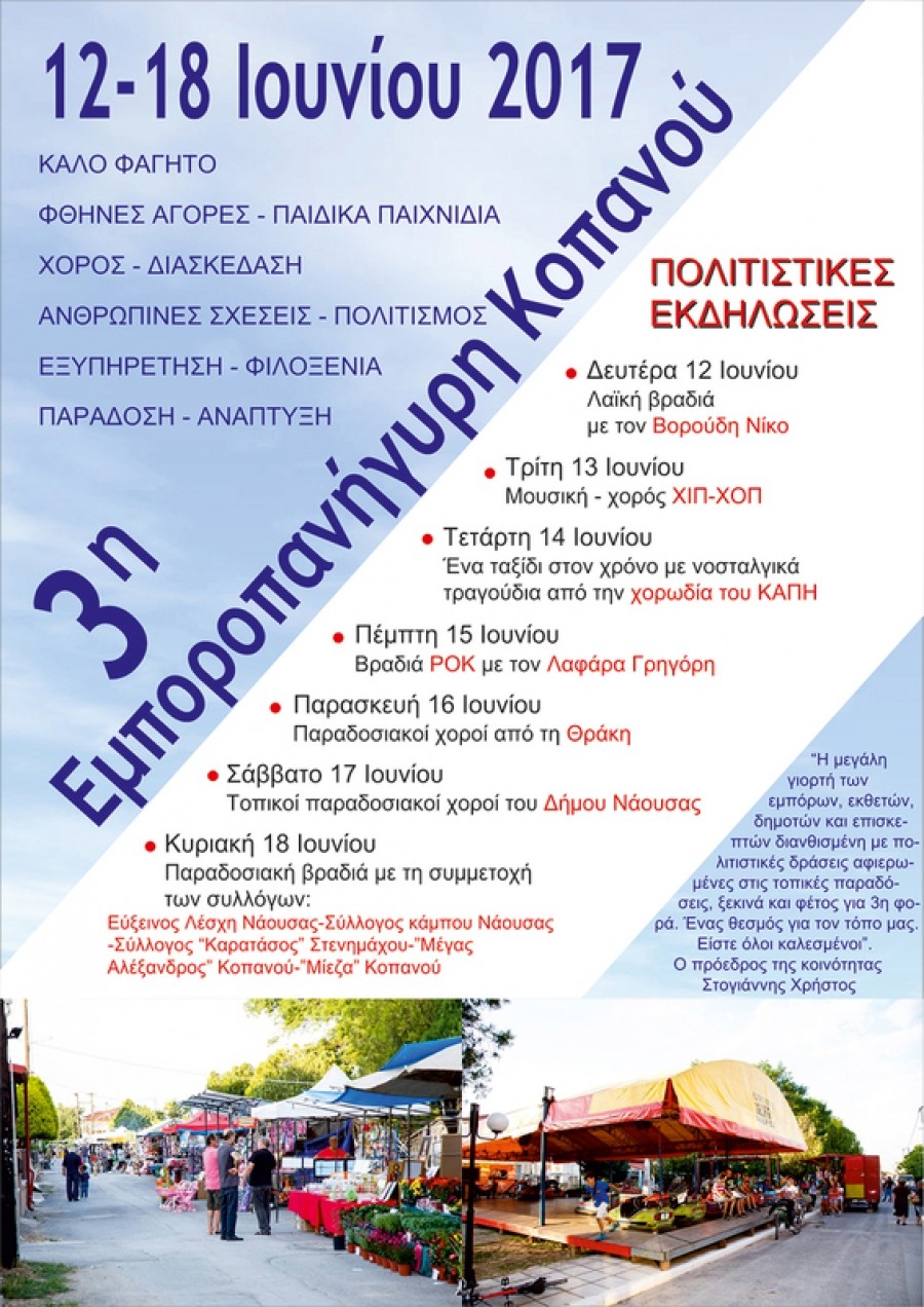 Κυριακή 18/6 : Παραδοσιακή βραδιά με τη συμμετοχή των συλλόγων: “Εύξεινος Λέσχη” Νάουσας, Σύλλογος Κάμπου Νάουσας, Σύλλογος «Καρατάσος» Στενημάχου, “Μέγας Αλέξανδρος” Κοπανού, “Μίεζα” Κοπανού.