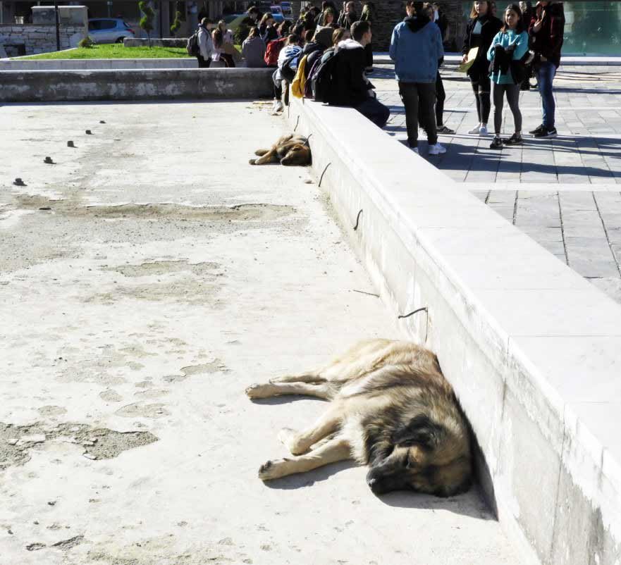 Αραχτά και αμέριμνα τα αδέσποτα μέσα στο «σιντριβάνι», περιμένουν να ξεκινήσει η πορεία και κατά το συνήθειό τους – όπως κάνουν και στις παρελάσεις – να ακολουθήσουν κανονικά…