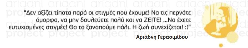Το πρόγραμμα είναι αφιερωμένο στη μνήμη της δημοσιογράφου Αριάδνης Γερασιμίδου και υλοποιείται με την προτροπή και υποστήριξη της Κυρίας Μαριάννας Λάτση.