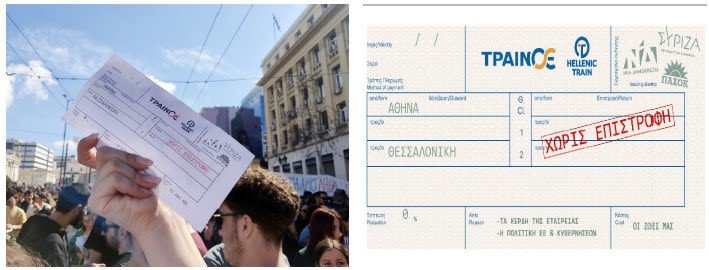 Στις ογκώδεις συγκεντρώσεις και πορείες που πραγματοποιήθηκαν χθες Τετάρτη σε όλη την χώρα ως ένδειξη διαμαρτυρίας για το πολύνεκρο δυστύχημα στα Τέμπη, οι πολίτες διαδήλωσαν κρατώντας πανό και πλακάτ με μηνύματα πένθους αλλά και διαμαρτυρίας προς κάθε υπεύθυνο. Ανάμεσα σε αυτά φοιτητές και μαθητές κρατούσαν και εισιτήρια(φωτογραφία) για την διαδρομή Αθήνα-Θεσσαλονίκη, που όπως αναγράφεται, χωρίς επιστροφή…