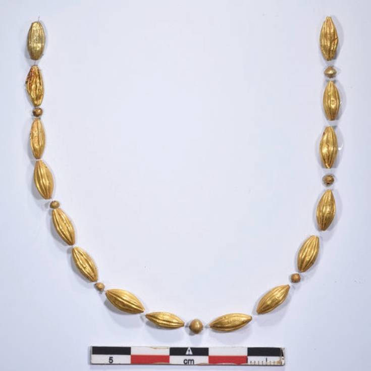 Πρόκειται για προσεκτικά κατασκευασμένο τάφο που «περιείχε σχεδόν ακέραιο και άθικτο σκελετό γυναίκας, ο οποίος συνοδευόταν από χάλκινο κάτοπτρο με ελεφαντοστέινη λαβή, οστέινες και χάλκινες περόνες ενδυμασίας, καθώς και περιδέραιο αποτελούμενο από 15 χρυσές ψήφους (χάντρες) σε σχήμα ελαιόκαρπου ή ελαιόσπορου και 15 μικρότερες επίσης χρυσές ψήφους. Αυτού του τύπου οι τάφοι είναι σχετικά σπάνιοι στην Κρήτη και απαντούν μόνο στην Κνωσσό και τα Χανιά», τονίζει το υπουργείο.
