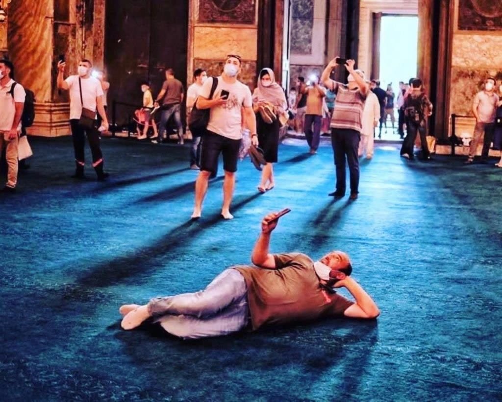 Δείχνει έναν «πιστό» να βρίσκεται ξαπλωμένος στο δάπεδο της ιστορικής Εκκλησίας που ο Ερντογάν μετέτρεψε σε τζαμί. Ο εν λόγω κύριος βγάζει σέλφι και δείχνει να… ξεκουράζεται με προκλητικό τρόπο, δείχνοντας ασέβεια σε ένα ιστορικό μνημείο.