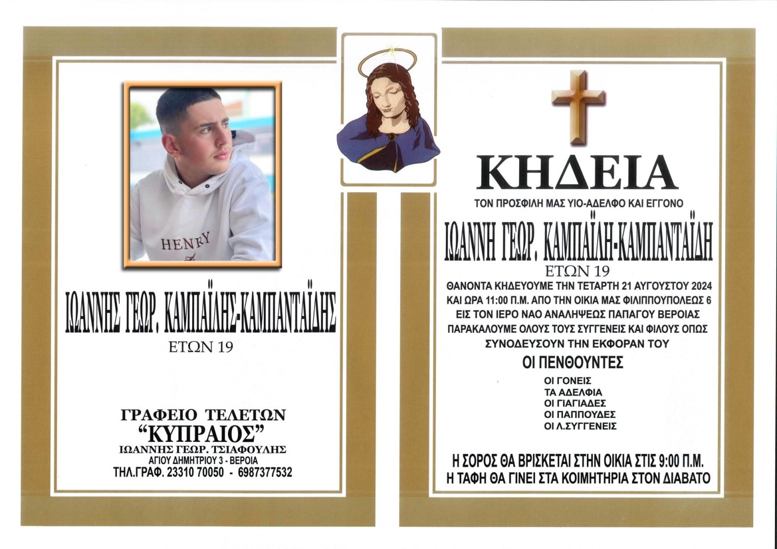 Αύριο Τετάρτη η κηδεία του 19χρονου Γιάννη Καμπαϊλή – Καμπανταΐδη