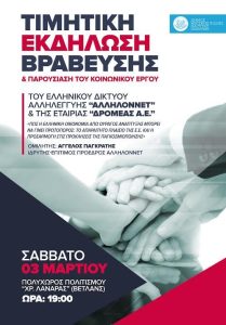Τιμητική εκδήλωση βράβευσης του ελληνικού δικτύου αλληλεγγύης «ΑΛΛΗΛΟΝnet και της εταιρείας «ΔΡΟΜΕΑΣ Α.Ε.» θα πραγματοποιηθεί από τον Δήμο.