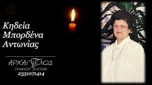 Έφυγε από τη ζωή και κηδεύεται την Δευτέρα 6 Μαΐου 2024 στις 12.00 μ.μ. από τον Ιερό Ναό Αγίου Αθανασίου (Κοιμητήρια) Βέροιας η Αντωνία Μπορδένα σε