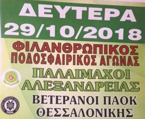 Φιλικός αγώνας φιλανθρωπικού χαρακτήρα θα γίνει την Δευτέρα 29/10, στις 15:45 στο Δημοτικό στάδιο Αλεξάνδρειας.Η ομάδα Παλαιμάχων της…