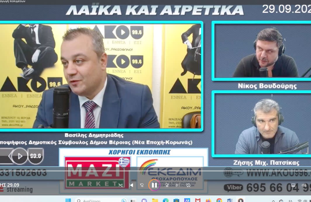 Τον δικηγόρο-διαμεσολαβητή, θεολόγο και ιστορικό Βασίλη Δημητριάδη είχε φιλοξενούμενο το μεσημέρι της Παρασκευής(29/9) η ραδιοφωνική εκπομπή Λαϊκά&Αιρετικά του ΑΚΟΥ 99.6, ο οποίος είναι υποψήφιος δημοτικός σύμβουλος Βέροιας με τον συνδυασμό «ΝΕΑ ΕΠΟΧΗ – αλλάΖΟΥΜΕ», του υπ. Δημάρχου Βέροιας Θεόφιλου Κορωνά. Ο κ. Δημητριάδης παρουσίασε τρεις σημαντικές προτάσεις που περιέχονται στο πρόγραμμα του συνδυασμού και για τις οποίες έχει δουλέψει ο ίδιος. Λόγω της στενής σχέσης που συνεχίζει να έχει με την ακαδημαϊκή κοινότητα, ο κ. Δημητριάδης μίλησε για μια ώριμη πρόταση, αφού έχουν γίνει προχωρημένες συζητήσεις για την άμεση ίδρυση Προγράμματος Μεταπτυχιακών Σπουδών της Θεολογικής Σχολής του ΑΠΘ στη Βέροια με θέμα τον Απόστολο Παύλο. Ο κ. Δημητριάδης υπογράμμισε ότι δεν χρειάζεται καν έγκριση από την πρυτανεία, απλά μόνο η υπογραφή ενός μνημονίου συνεργασίας του δήμου Βέροιας με τον Ε.Λ.Κ.Ε. Α.Π.Θ.(Ειδικός Λογαριασμός Κονδυλίων Έρευνας), ενώ παράλληλα ανέφερε ότι υπάρχει δυνατότητα να ξεκινήσουν διαδικασίες για την ίδρυση τμήματος προπτυχιακών σπουδών, καταθέτοντας αρχικά μια μελέτη σκοπιμότητας και βιωσιμότητας. «Στόχος μας αρχικά είναι να βλέπουμε μέσω του μεταπτυχιακού 50 φοιτητές για περίπου 25 εβδομάδες να κινούνται στη Βέροια και να αφήνουν τον οβολό τους», πρόσθεσε ο κ. Δημητριάδης.