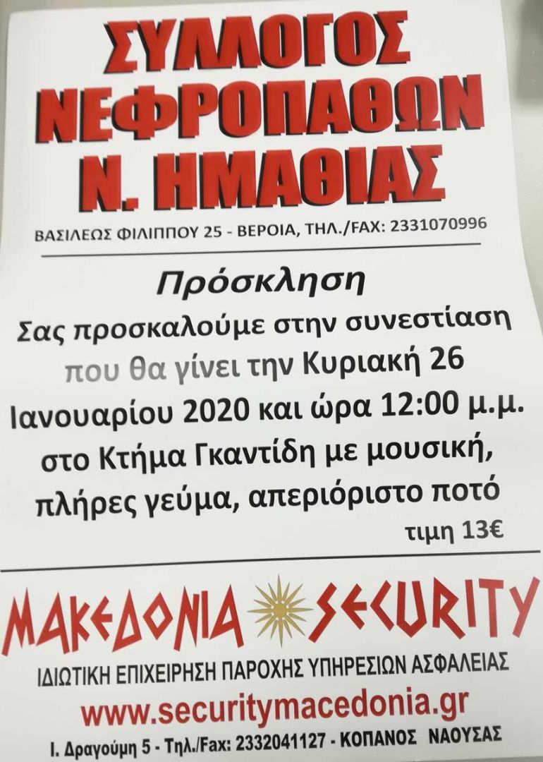 Ο Σύλλογος Νεφροπαθών Βέροιας σας προσκαλεί στην συνεστίαση που θα γίνει την Κυριακή 26 Ιανουαρίου 2020, στις 12:00 μ.μ. στο Κτήμα Γκαντίδη, με μουσική, πλήρες γεύμα και απεριόριστο ποτό.