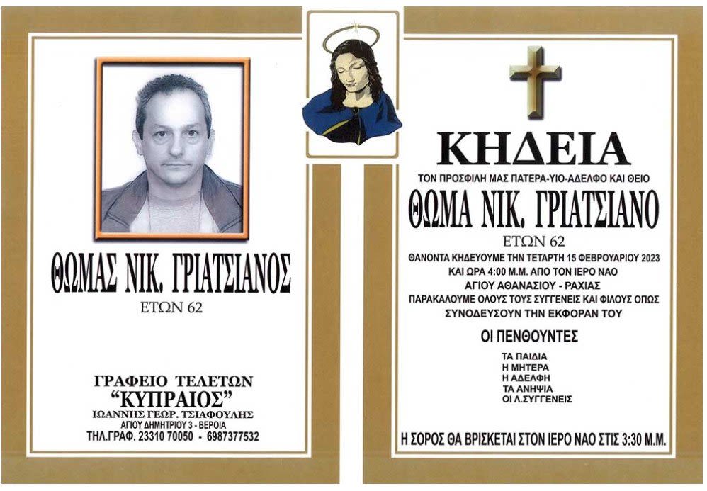 Η κηδεία του εκλιπόντος θα τελεστεί την Τετάρτη 15 Φεβρουαρίου 2023, στις 4 μμ, στο Ναό Αγ. Αθανασίου Ραχιάς Δ. Βέροιας. Η σορός θα βρίσκεται στο Ναό στις 3.30 μμ της ίδιας ημέρας.
