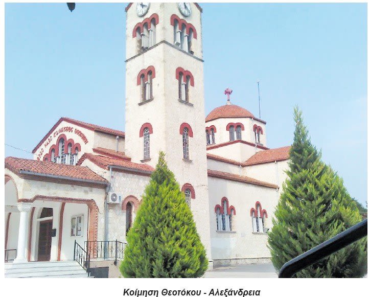 -Στην Αλεξάνδρεια ο σημερινός ναός ο αφιερωμένος στην Κοίμηση της Θεοτόκου άρχισε να κτίζεται το 1965 και ολοκληρώθηκε το 1971. Από το βιβλίο του Γιάννη Μοσχόπουλου, Δικηγόρου-Ερευνητή «Ρουμλουκιώτικα Σημειώματα (1996)» πληροφορούμαστε ότι στον χώρο του σημερινού ναού υπήρχε παλαιότερος ναός που είχε κτιστεί το 1843, χρονιά που αγιογραφήθηκε και η εικόνα της Παναγίας της Βρεφοκρατούσας διαστάσεων 112χ77εκ. που υπάρχει στο ναό και είναι έργο του αγιογράφου Μανουήλ Ζωγράφου. Την ευθύνη ανέγερσης του σημερινού ναού είχε ο Δημήτρης Γκαρανάτσιος ενώ άξιο έρευνας είναι το γεγονός της πιθανής ύπαρξης μοναστηριού στο χώρο γύρω από τη σημερινή εκκλησία.