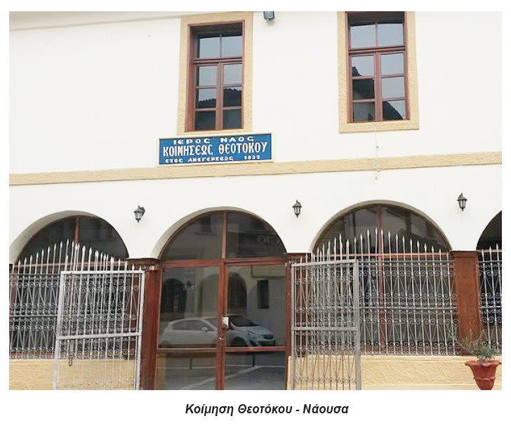 -Στη Νάουσα μία από τις μεγαλύτερες και ιστορικότερες εκκλησίες η γνωστή «Παναγία» είναι αφιερωμένη στην Κοίμηση της Θεοτόκου. Ο ναός κτίσθηκε το 1833, είναι ρυθμού βασιλικής-τρίκλιτης χωρίς τρούλο με ξύλινη στέγη. Τα έξοδα ανέγερσης κάλυψε ο (Χατζή)Πέτρος Παπαναστασίου, γιος του Παπα-Αναστάση που λειτουργούσε στην εκκλησία του Αγίου Γεωργίου. Αρχιμάστορας στην ανέγερση ήταν ο Γιαννούσης Γκίκας.