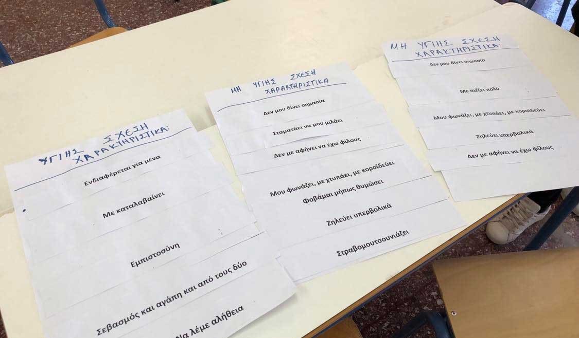Μέσα από παιχνίδι ρόλων οι έφηβοι εξοικειώθηκαν με τα χαρακτηριστικά των υγιών και μη υγιών σχέσεων, καθώς και τρόπους επικοινωνίας και διαχείρισης προβλημάτων βίας. Επιπλέον έγινε ειδική αναφορά στον σχολικό εκφοβισμό μέσα από τις κοινωνικές ιστορίες.