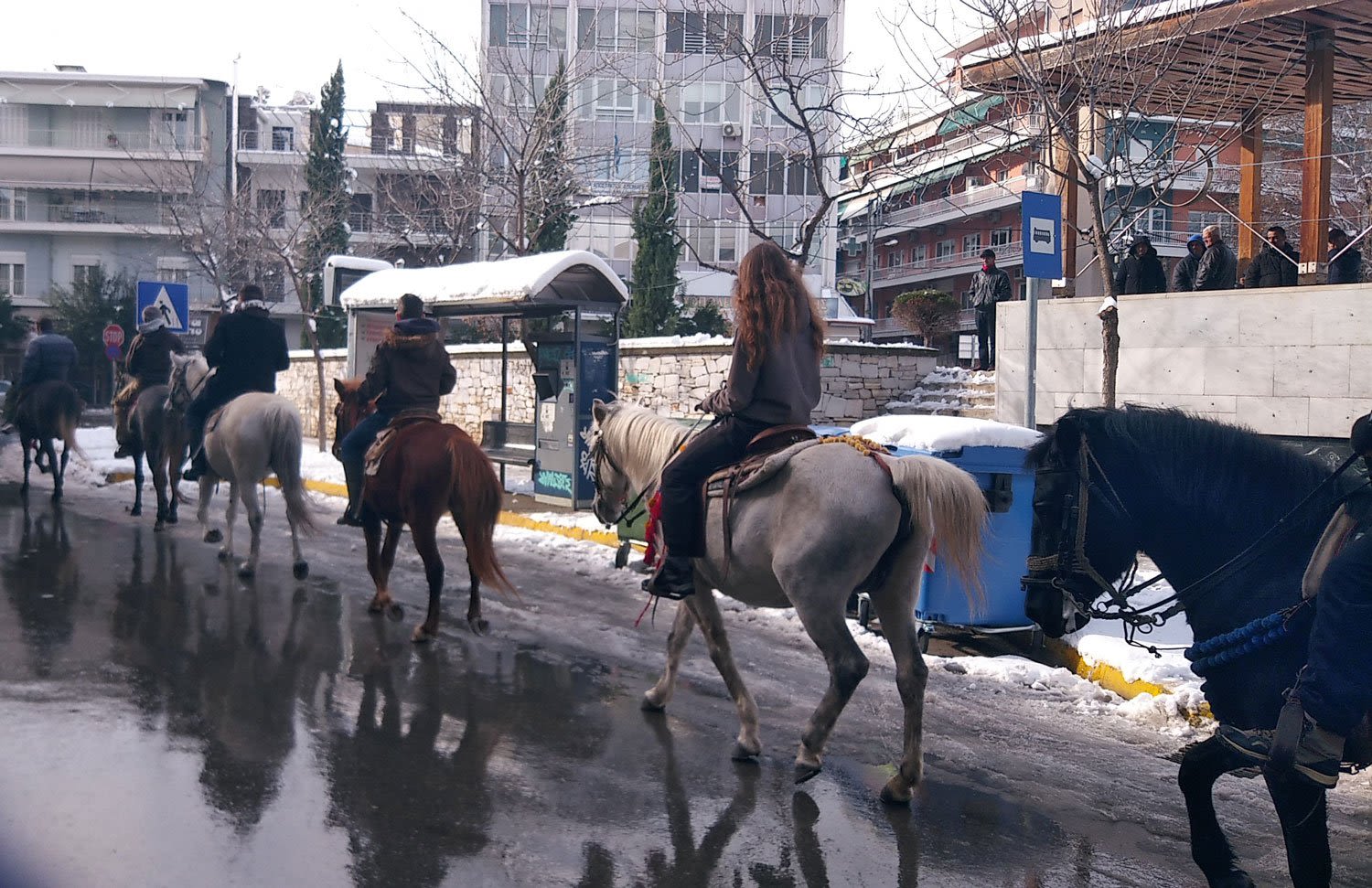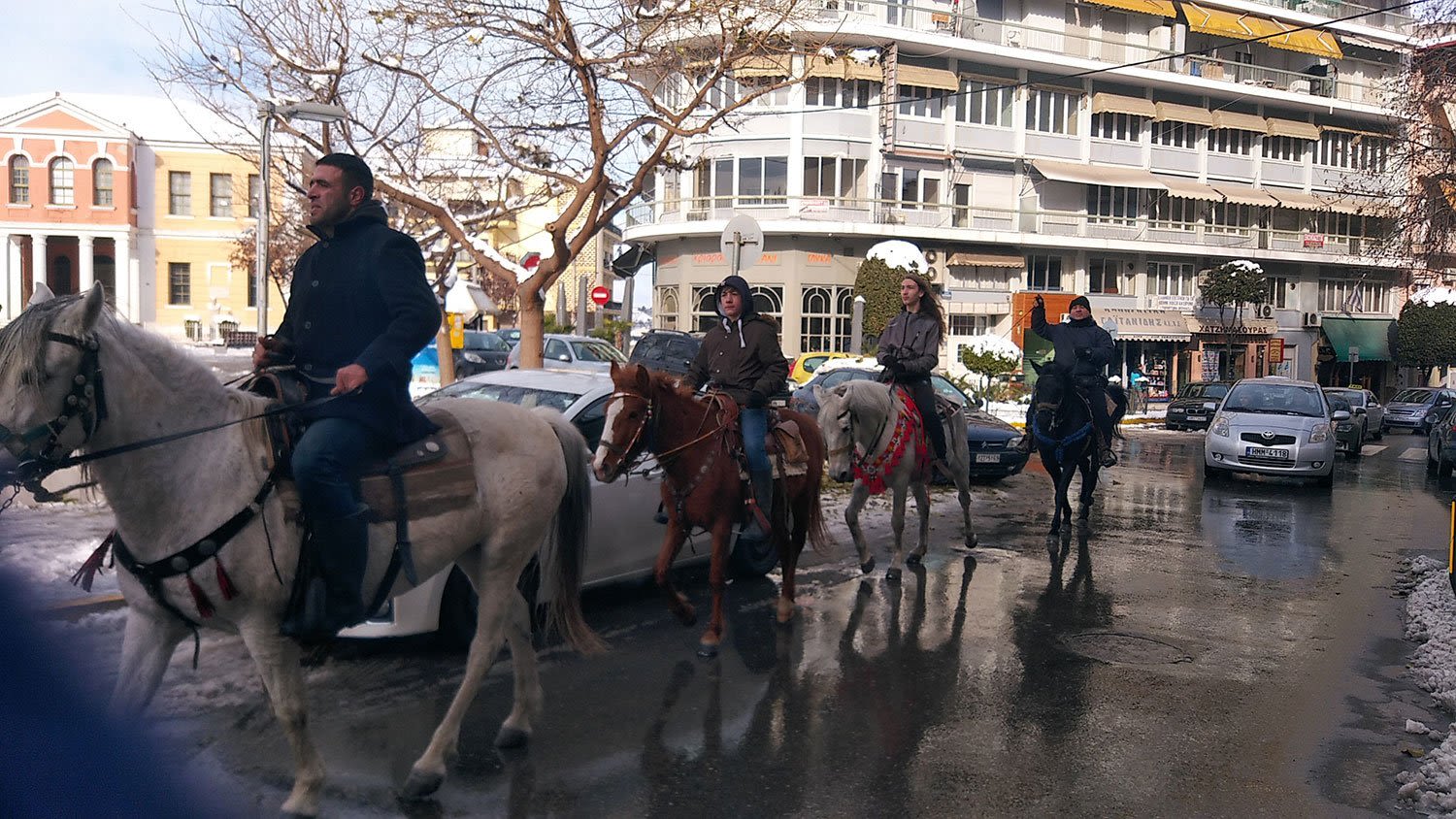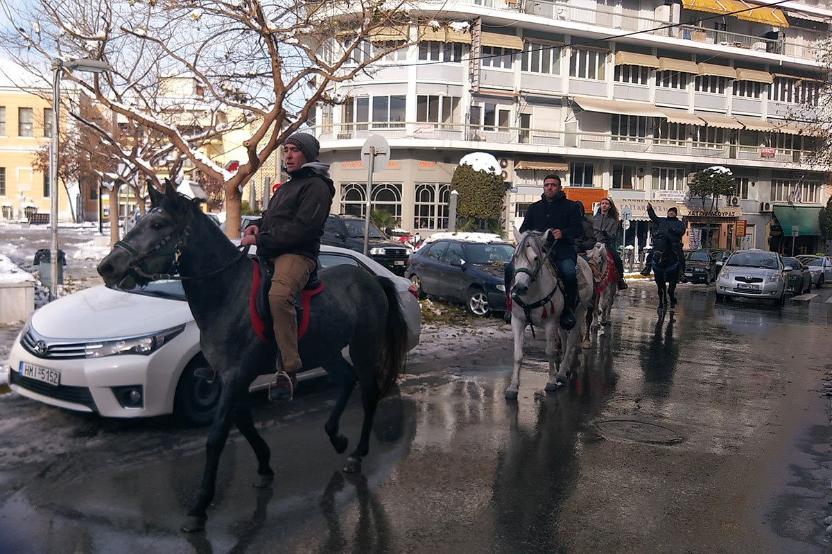 Παρά την παγωνιά και τα χιόνια τηρώντας πιστά τα πατροπαράδοτα έθιμα, εντυπωσίασαν μικρούς και μεγάλους που είδαν έφιππη πομπή να διασχίζει την Μητροπόλεως, Βενιζέλου,