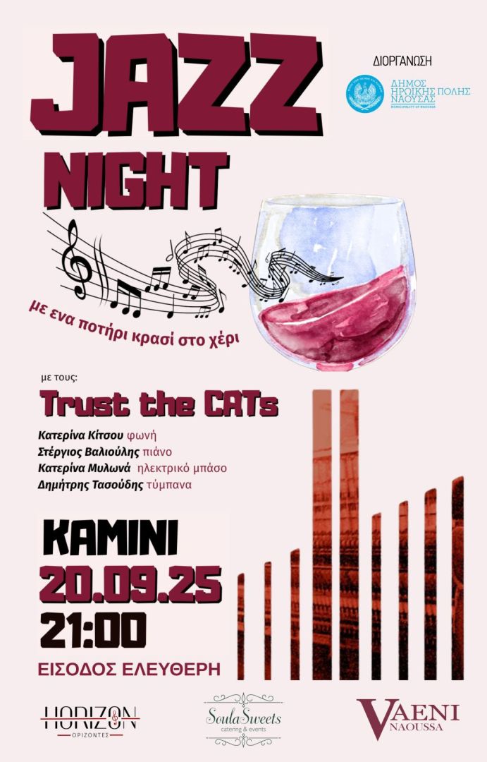 Ένας ιδιαίτερος και κατάλληλος για να υποδεχτούμε το φθινόπωρο χώρος και να απολαύσουμε ένα ποτήρι κρασί, στους ρυθμούς της JAZZ, από τους Trust the CATs μία μπάντα τετραμελής, η οποία απαρτίζεται από μουσικούς της Θεσσαλονίκης και της Νάουσας. Τη χαρακτηρίζει ο δικός της ξεχωριστός ήχος στην jazz σκηνή. Φωνή, πιάνο, ηλεκτρικό μπάσο και τύμπανα δένουν με ένα δικό τους τρόπο την ιδέα της κλασικής μπάντας με μία φρέσκια ματιά. Με όλο το κλασικό ρεπερτόριο των jazz standards που έχει αγαπηθεί και όχι μόνο, εκτείνεται και σε pop, swing, funk αλλά και latin ρυθμούς, πάντα με το επίχρισμα της jazz, σε διασκευές των Trust the CATs.
