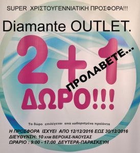To OUTLET κατάστημα της εταιρείας Diamante ενόψει των Χριστουγέννων προσφέρει με την αγορά 2 προϊόντων 1 ακόμη δωρεάν. Εκμεταλλευτείτε την απίθανη