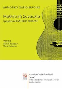 Παραδοσιακές μελωδίες και έργα λόγιας μουσικής για κλασσική κιθάρα, θα παρουσιάσουν μαθητές του Δημοτικού Ωδείου της ΚΕΠΑ Δήμου Βέροιας,…