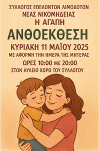 Ο Σύλλογος Εθελοντών Αιμοδοτών Νέας Νικομήδειας «Η ΑΓΑΠΗ» σας προσκαλεί με χαρά στην Ανθοέκθεση που θα διοργανώσει την Κυριακή 11 Μαΐου 2025,.