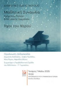 Το Δημοτικό Ωδείο της ΚΕΠΑ Δήμου Βέροιας, παρουσιάζει την μαθητική συναυλία «Οι Ήχοι του Νερού», που πραγματοποιείται από το τμήμα πιάνου…