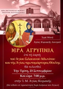 Ιερά Αγρυπνία θα τελεσθεί στην Ιερά Μονή Αγίας Κυριακής Λουτρού, την Τρίτη 23Σεπτεμβρίου και ώρα 19:00, επί τη εορτή της Αγίας Ισαποστόλου και..