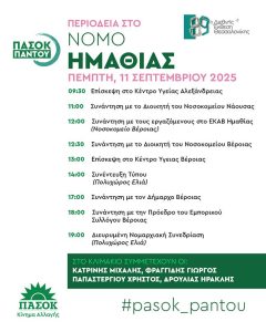 Η Νομαρχιακή Επιτροπή Ημαθίας του ΠΑΣΟΚ – Κίνημα Αλλαγής σας ενημερώνει ότι αύριο Πέμπτη 11 Σεπτεμβρίου 2025, κλιμάκιο στελεχών του…