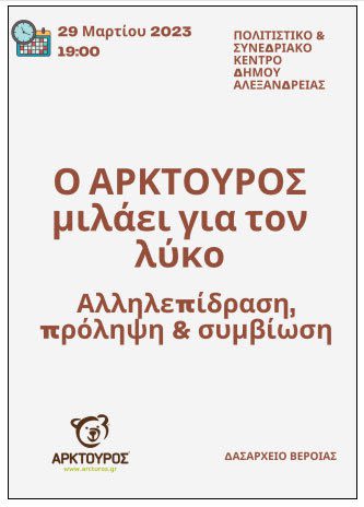 Το Δασαρχείο Βέροιας συνδιοργανώνει με την περιβαλλοντική οργάνωση ΑΡΚΤΟΥΡΟΣ, ενημερωτική εκδήλωση με θέμα: «Ο ΑΡΚΤΟΥΡΟΣ μιλάει για τον λύκο. Αλληλεπίδραση, πρόληψη & συμβίωση», την Τετάρτη 29 Μαρτίου 2023 και ώρα 19.00 στο Πολιτιστικό και Συνεδριακό Κέντρο του Δήμου Αλεξάνδρειας.