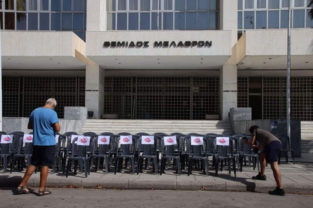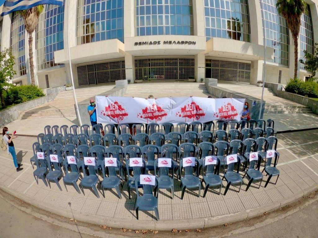 Οι συγκεντρωμένοι φορώντας μάσκες ανάρτησαν πανό όπου αναγραφόταν το σύνθημα, μπροστά από μια «μικρογραφία» της δικαστικής αίθουσας.