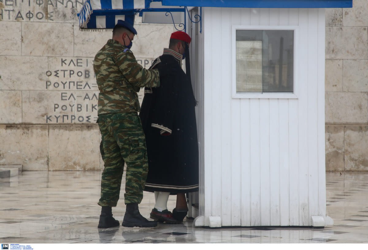 Η παγωνιά και οι πολικές θερμοκρασίες που οφείλονται στην κακοκαιρία «Μήδεια» που επελαύνει τις τελευταίες ημέρες στη χώρα μας, φαίνεται πως δεν «ακουμπάνε» την Προεδρική Φρουρά, με τους Έλληνες στρατιώτες να στέκονται «ατάραχοι» πιστοί στο καθήκον και στην υπηρεσία τους.