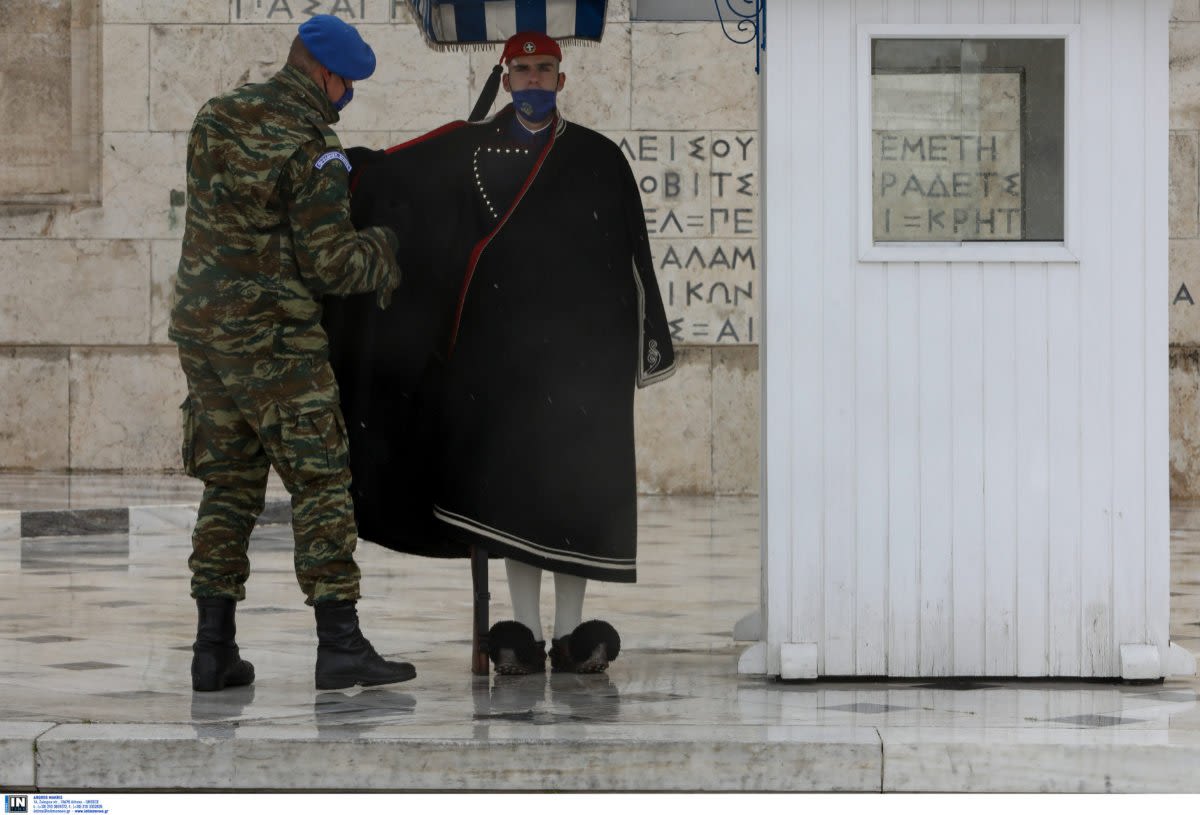 O φωτογραφικός φακός απαθανάτισε τη στιγμή που γινόταν η αλλαγή στην Προεδρική Φρουρά, με τα πλάνα να δείχνουν τους Έλληνες στρατιώτες να μην επηρεάζονται και να μην τους «πιάνει» η παγωνιά, παρά τις εξαιρετικά αντίξοες καιρικές συνθήκες.
