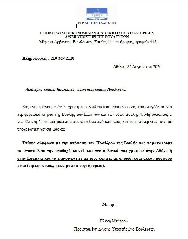 “Ενημερώνω όλες τις Ημαθιώτισσες και όλους τους Ημαθιώτες ότι μέσα στα πλαίσια της προληπτικής αντιμετώπισης με στόχο τον αποτελεσματικότερο περιορισμό της διασποράς του κορονοϊού και έπειτα και από σχετικές οδηγίες που δόθηκαν από τη Βουλή των Ελλήνων σε όλους τους Βουλευτές, τα πολιτικά μου γραφεία στη Βέροια και στην Αθήνα ΔΕΝ ΘΑ ΥΠΟΔΕΧΟΝΤΑΙ ΤΟ ΚΟΙΝΟ για το επόμενο χρονικό διάστημα και μέχρι νεωτέρας.