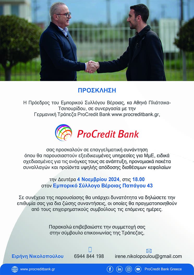 Η νέα επαγγελματική συνάντηση θα πραγματοποιηθεί την Δευτέρα 4 Νοεμβρίου 2024, στις 18.00 στον Εμπορικό Σύλλογο Βέροιας Παπάγου 43 όπου θα παρουσιαστούν εξειδικευμένες υπηρεσίες για Μμε ειδικά σχεδιασμένες για τις ανάγκες τους σε ανάπτυξη, προνομιακά πακέτα συναλλαγών και προϊόντα υψηλής απόδοσης διαθέσιμων κεφαλαίων.