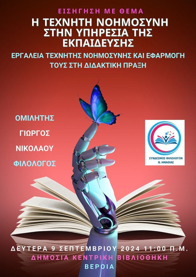 Δευτέρα 9 Σεπτεμβρίου στη Δημόσια Βιβλιοθήκη Βέροιας- Εκδήλωση για την τεχνητή νοημοσύνη στην υπηρεσία της εκπαίδευσης