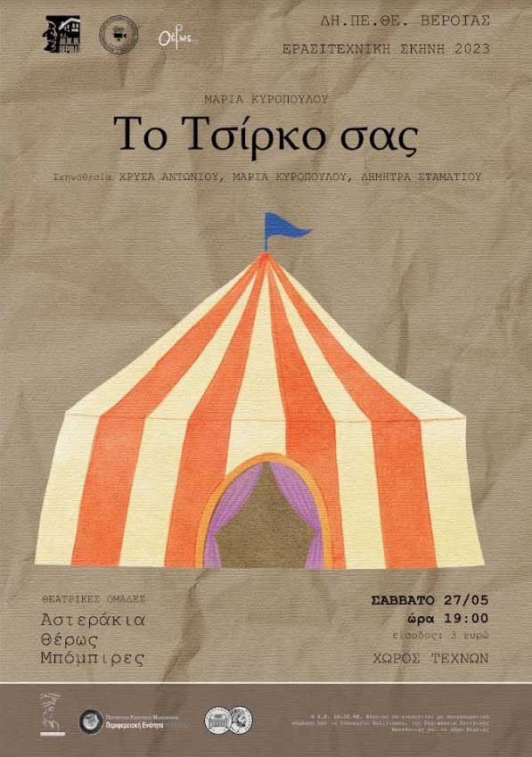 Το Σάββατο 27 Μαΐου στις 7.00 μ.μ. στο Χώρο Τεχνών οι ομάδες «Αστεράκια» και «Μπόμπιρες» των Θεατρικών Εργαστηρίων του ΔΗ.ΠΕ.ΘΕ. Βέροιας σε συνεργασία με τη Θεατρική Ομάδα «Θέρως» της «Κινηματόδρασις» θα παρουσιάσουν «Το Τσίρκο σας».