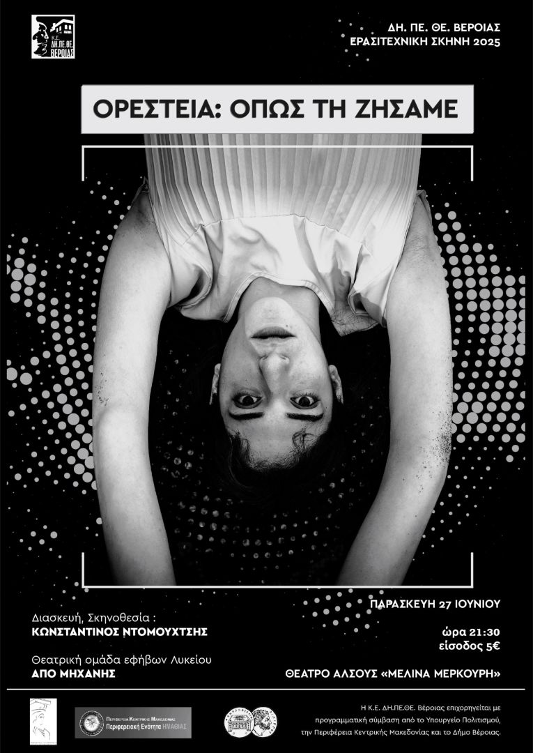 ΔΗ.ΠΕ.ΘΕ. Βέροιας| ΕΡΑΣΙΤΕΧΝΙΚΗ ΣΚΗΝΗ 2025 Θεατρική Ομάδα Εφήβων Λυκείου ΑΠΟ ΜΗΧΑΝΗΣ «Ορέστεια: Όπως τη Ζήσαμε» ΠΑΡΑΣΚΕΥΗ 27 ΙΟΥΝΙΟΥ 2025, ώρα 21:30 ΘΕΑΤΡΟ ΑΛΣΟΥΣ «ΜΕΛΙΝΑ ΜΕΡΚΟΥΡΗ»