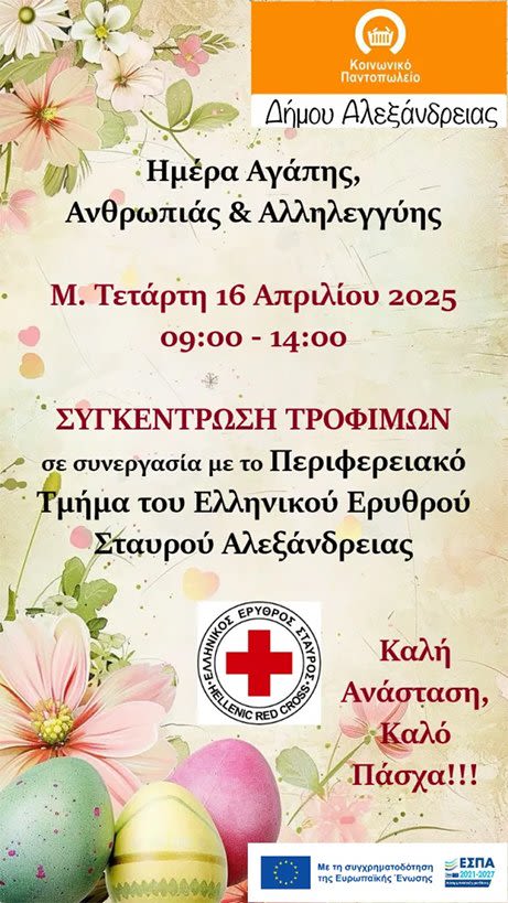 Δήμος Αλεξάνδρειας: Μ. Τετάρτη 16 Απριλίου – “Ημέρα Αγάπης, Ανθρωπιάς και Αλληλεγγύης”