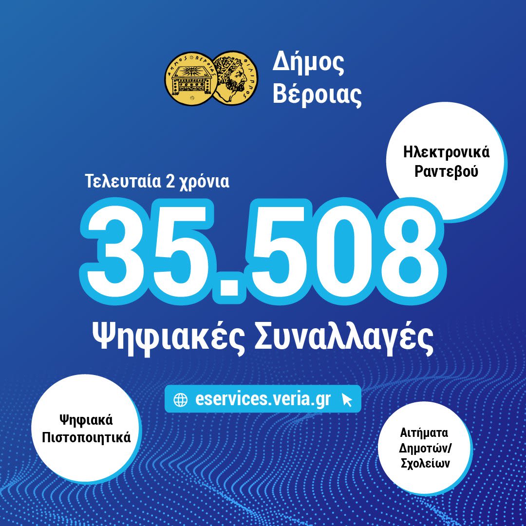 Άκρως ενθαρρυντικά είναι τα στοιχεία των δύο τελευταίων ετών για την εξέλιξη των ψηφιακών υπηρεσιών και την ανταπόκριση των δημοτών στις αναβαθμισμένες ηλεκτρονικές πλατφόρμες του Δήμου Βέροιας. Από το 2020 όπου συστάθηκε η Αντιδημαρχία Ηλεκτρονικής Διακυβέρνησης και Ψηφιακής Πολιτικής πραγματοποιήθηκαν συνολικά 35.508 ηλεκτρονικές εξυπηρετήσεις πολιτών. Τα στοιχεία που συλλέχθηκαν σχετικά με την ευκολότερη και αποτελεσματικότερη ολοκλήρωση των εργασιών, βασισμένα στην άμεση εξυπηρέτηση του κοινού -χωρίς ουρές στα γκισέ- και στη μείωση της γραφειοκρατίας αφορούν σε: