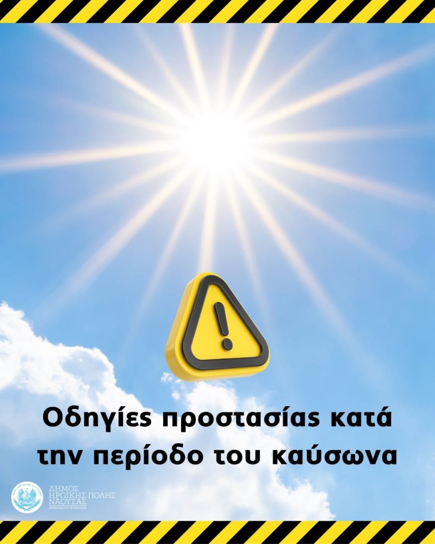 Ο Δήμος Ηρωικής Πόλεως Νάουσας, ενόψει της επικείμενης ανόδου της θερμοκρασίας και της πρόβλεψης παρατεταμένων υψηλών θερμοκρασιών τις επόμενες ημέρες, ενημερώνει τους δημότες για τα μέτρα πρόληψης και προστασίας που πρέπει να τηρούνται προκειμένου να διασφαλιστεί η δημόσια υγεία και ασφάλεια, ιδίως των ευάλωτων ομάδων του πληθυσμού.