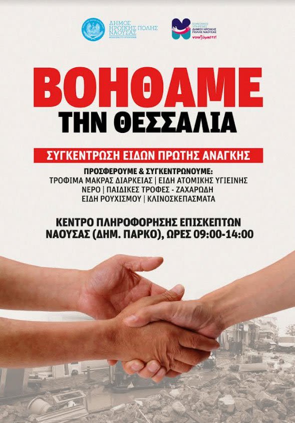 Ο Δήμος Νάουσας ενημερώνει ότι η συγκέντρωση των ειδών πρώτης ανάγκης για τους πλημμυροπαθείς της Θεσσαλίας θα συνεχιστεί και την ερχόμενη εβδομάδα, καθώς οι ανάγκες για βοήθεια των πληγέντων είναι αυξημένες.