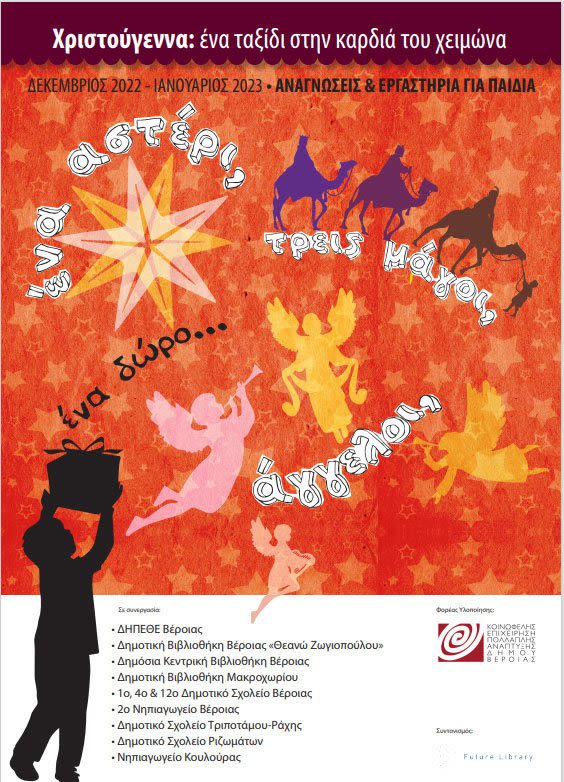 Μαζί με τα παιδιά θα ακολουθήσουμε το μυστηριώδες αστέρι που θα μας οδηγήσει στους δρόμους και τα μονοπάτια που ταξίδεψαν οι τρεις μάγοι. Οι άγγελοι θα μας αφηγηθούν τις ιστορίες τους. Στο τέλος θα βρούμε την παλιά χαρά να φτιάχνεις μικρά δώρα από ευχές και να τα χαρίζεις στους γύρω σου. Η θαλπωρή των γιορτών θα συμπυκνωθεί στις ιστορίες και τις αφηγήσεις που θα μοιραζόμαστε στις Βιβλιοθήκες και σε σχολεία.