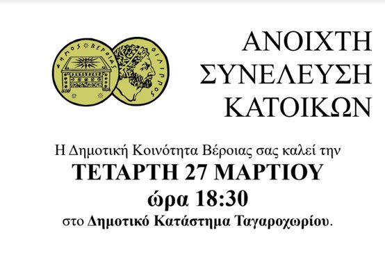 Η Δημοτική Κοινότητα Βέροιας και τα μέλη της, θα παρευρίσκονται την Τετάρτη, 27 Μαρτίου και ώρα 18:30 στο Δημοτικό Κατάστημα Ταγαροχωρίου.