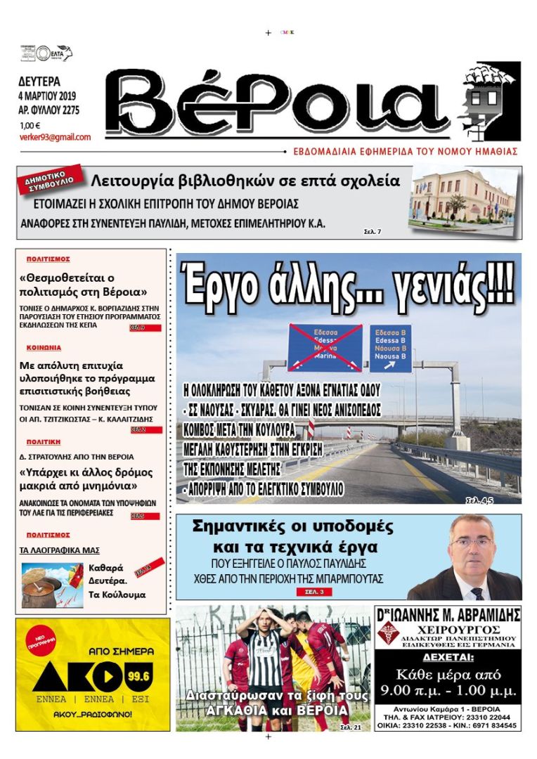 Η ΟΛΟΚΛΗΡΩΣΗ ΤΟΥ ΚΑΘΕΤΟΥ ΑΞΟΝΑ ΕΓΝΑΤΙΑΣ ΟΔΟΥ – ΣΣ ΝΑΟΥΣΑΣ – ΣΚΥΔΡΑΣ. ΘΑ ΓΙΝΕΙ ΝΕΟΣ ΑΝΙΣΟΠΕΔΟΣ ΚΟΜΒΟΣ ΜΕΤΑ ΤΗΝ ΚΟΥΛΟΥΡΑ
