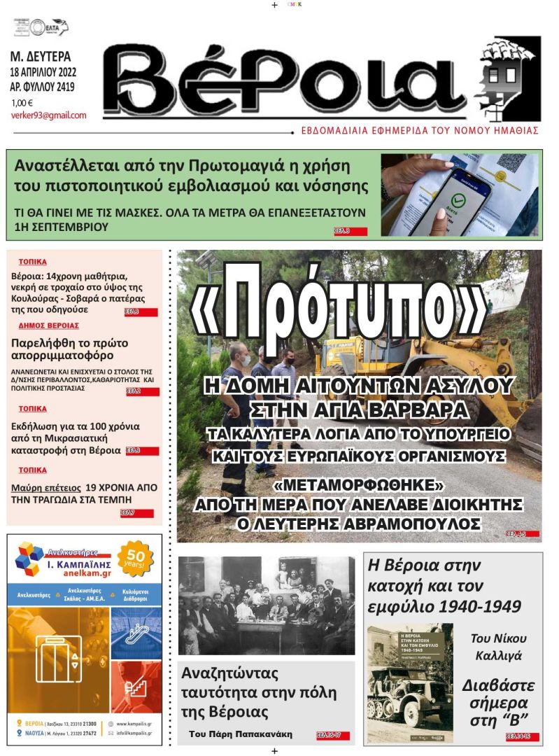Διαβάστε αύριο στην εφημερίδα “ΒΕΡΟΙΑ” (18/4/2022)