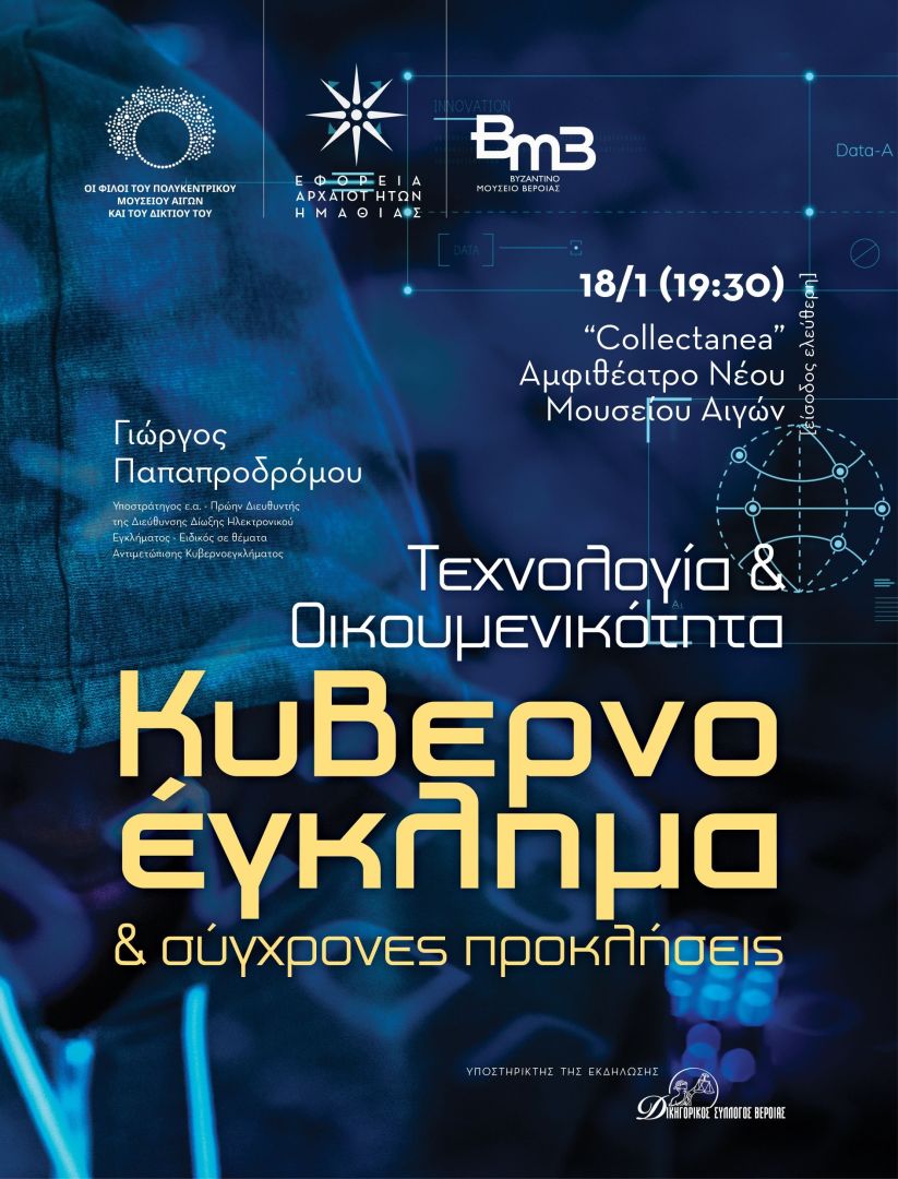 Οι Φίλοι του Πολυκεντρικού Μουσείου των Αιγών και του Δικτύου του σε συνεργασία με την Εφορεία Αρχαιοτήτων Ημαθίας, με την υποστήριξη του Δικηγορικού Συλλόγου Βέροιας, σας προσκαλούν στην διάλεξη του Γιώργου Παπαπροδρόμου (Υποστρατήγου ε.α. – πρώην Διευθυντή της Διεύθυνσης Δίωξης Ηλεκτρονικού Εγκλήματος – Ειδικού σε θέματα Αντιμετώπισης Κυβερνοεγκλήματος), με θέμα: «Τεχνολογία και Οικουμενικότητα: Κυβερνοέγκλημα και σύγχρονες προκλήσεις”, η οποία θα πραγματοποιηθεί στις 18/1 και ώρα 19:30 στο Αμφιθέατρο του Νέου Μουσείου των Αιγών.