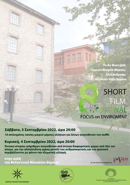 Ο σύλλογος Φίλων Πολυκεντρικού Μουσείου Αιγών και η Λέσχη Κινηματογράφου και Πολιτισμού Αλεξάνδρειας σε συνεργασία με την Εφορεία Αρχαιοτήτων Ημαθίας, σας προσκαλούν σε ένα διήμερο κινηματογραφικών προβολών που θα πραγματοποιηθούν στον αύλειο χώρο του Βυζαντινού Μουσείου Βέροιας στις 3 και 4 Σεπτεμβρίου 2022 και ώρα 20:00.