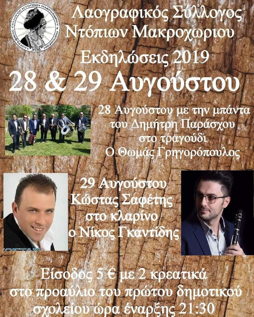 Ο Λαογραφικός Σύλλογος Ντόπιων Μακροχωρίου και Περιχώρων για 26η Χρόνια διοργανώνει διήμερο παραδοσιακών εκδηλώσεων 28 και 29 Αυγούστου στο Μακροχώρι Ημαθίας.