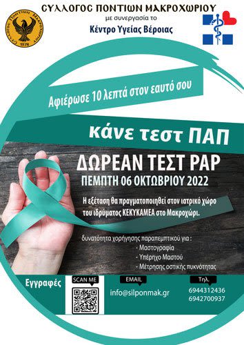 διοργανώνει στις 06 Οκτωβρίου 2022, ΔΩΡΕΑΝ λήψη Τεστ ΠΑΠ για γυναίκες.