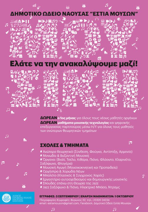 Από τις 1 Οκτωβρίου 2018 και για ένα μήνα το Δημοτικό Ωδείο Νάουσας δίνει την ευκαιρία σε όσους μαθητές και μαθήτριες, νέους και νέες σκέφτονται στο άμεσο μέλλον να ξεκινήσουν την εκμάθηση ενός μουσικού οργάνου, να λάβουν δωρεάν αυτά τα πρώτα μαθήματα γνωριμίας με το όργανο της αρεσκείας τους καθώς επίσης και να παρακολουθήσουν τα τμήματα της μουσικής προπαιδείας και του μπαλέτου.