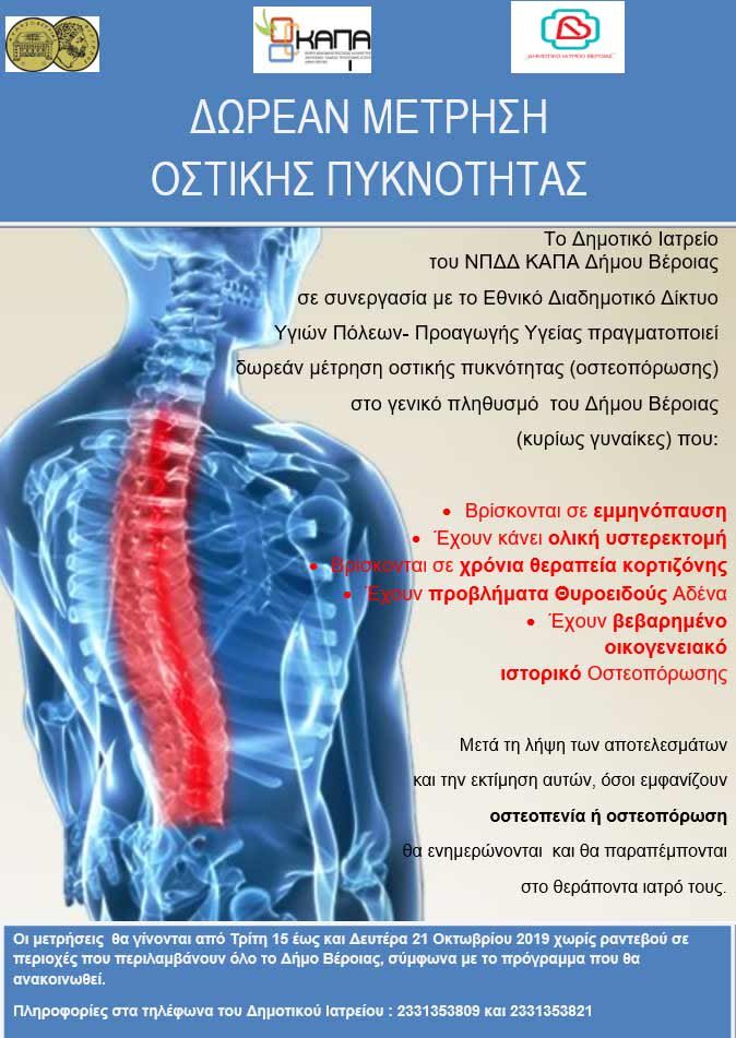 Το Δημοτικό Ιατρείο του ΝΠΔΔ ΚΑΠΑ Δήμου Βέροιας σε συνεργασία με το Εθνικό Διαδημοτικό Δίκτυο Υγιών Πόλεων- Προαγωγής Υγείας πραγματοποιεί δωρεάν μέτρηση οστικής πυκνότητας (οστεοπόρωσης) στο γενικό πληθυσμό του Δήμου Βέροιας (κυρίως γυναίκες) που: