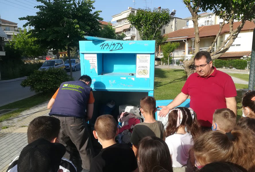 Αρχικά, οι μαθητές/τριες επισκέφθηκαν το γειτονικό στο σχολείο κάδο ανακύκλωσης ρούχων, όπου παρακολούθησαν δια ζώσης τη συγκομιδή αυτών από τη σχετική εταιρεία που συνεργάζεται με το Δήμο Βέροιας και ενημερώθηκαν για την διαδικασία ανακύκλωσης ρούχων και παπουτσιών από τον Αντιδήμαρχο Καθαριότητας-Ανακύκλωσης-Περιβάλλοντος του Δήμου Βέροιας κ. Βασίλη Παπαδόπουλο.