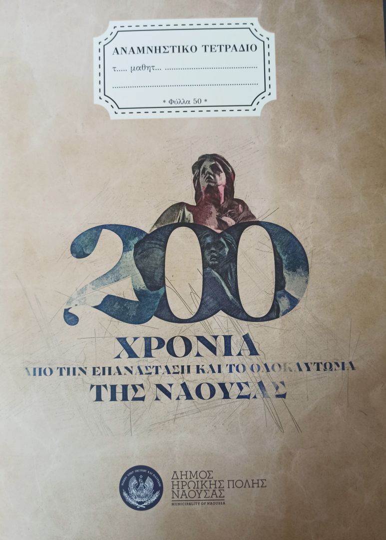 Ο Δήμος Η.Π. Νάουσας, στο πλαίσιο των επετειακών δράσεων, με αφορμή την συμπλήρωση 200 ετών από την Επανάσταση και το Ολοκαύτωμα της πόλης, προχώρησε στην εκτύπωση ειδικών επετειακών τετραδίων για τους μαθητές Δημοτικών, Γυμνασίων και Λυκείων.